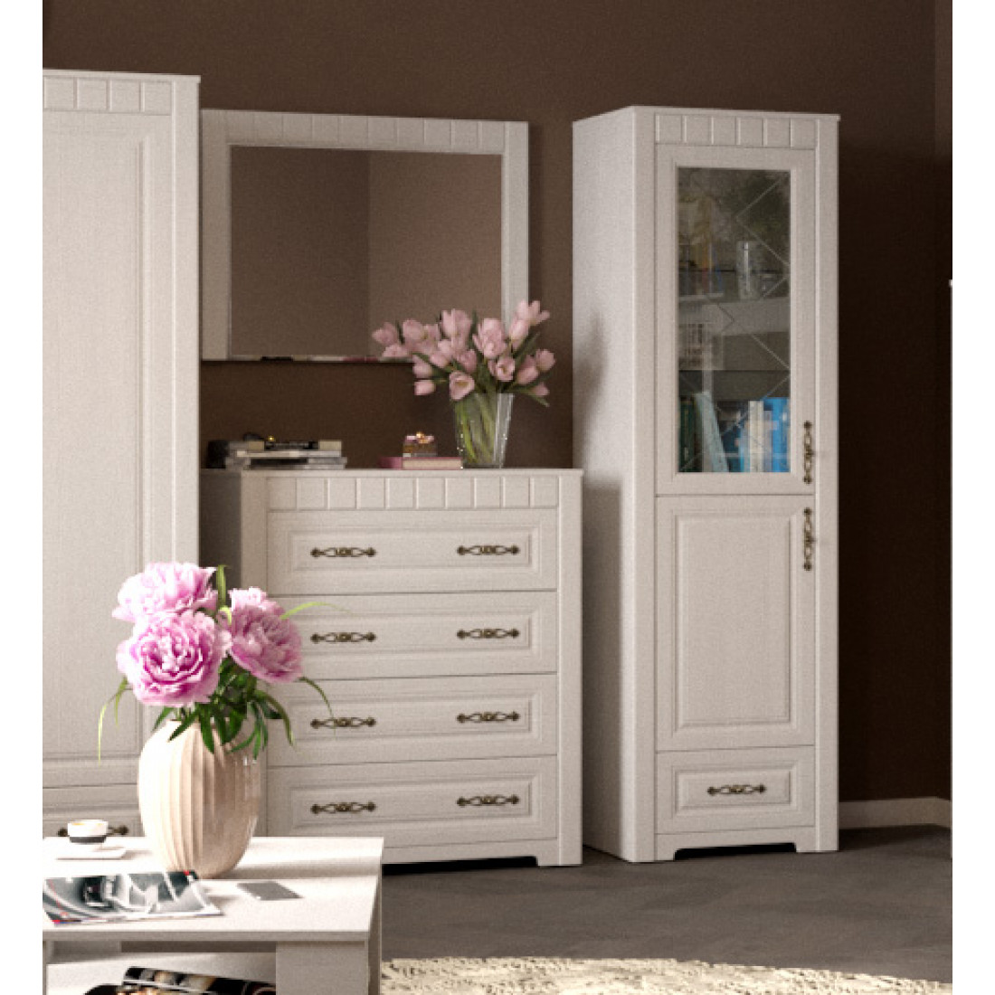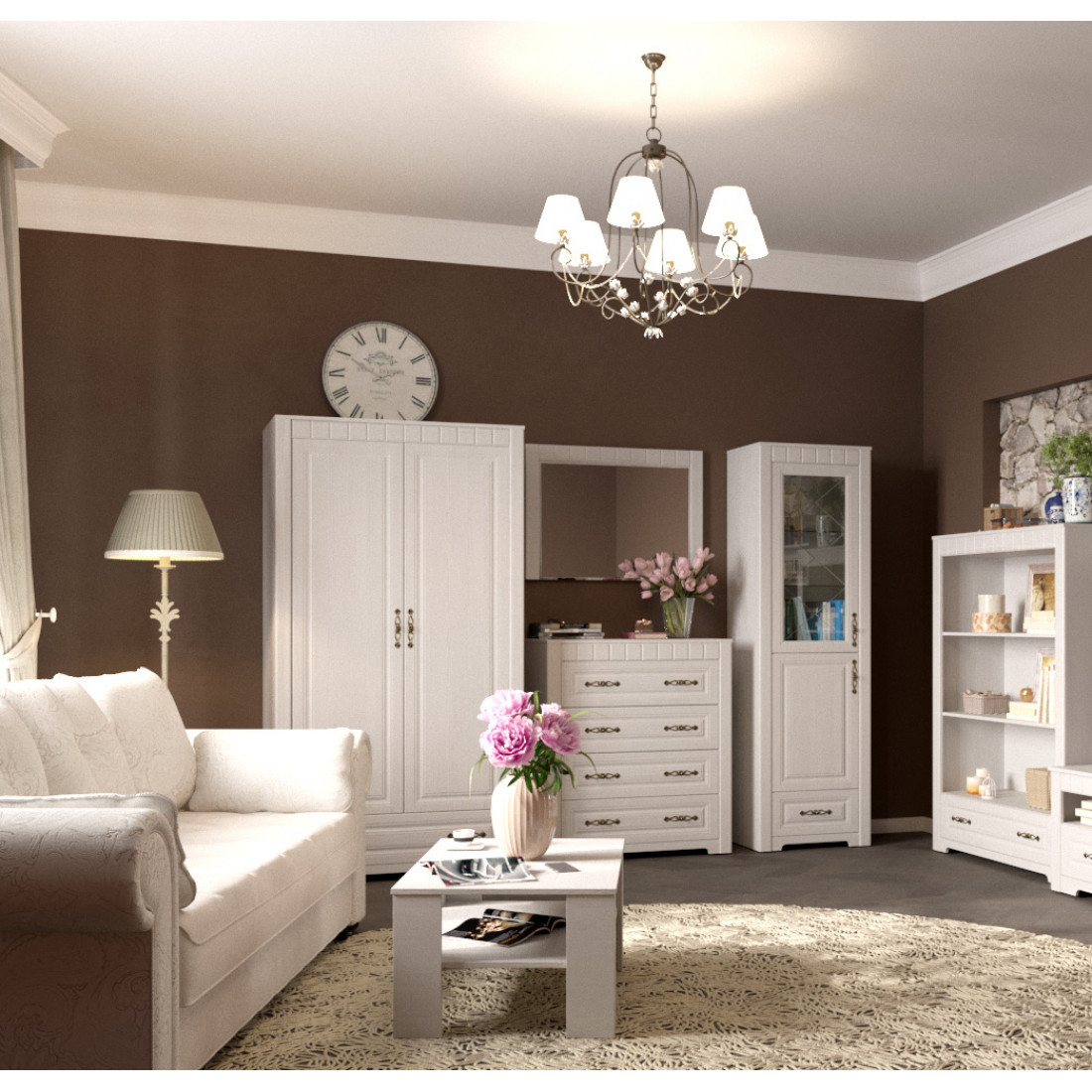 Гостиная Прованс композиция 2 от Мебельград - легкие ноты очарования сельской местности, простота линий и домашний уют - вот основные мотивы мебели этого стиля. На полках Вы сможете разместить свои любимые предметы интерьера, книги, вазы, памятные сувениры, которыми завершите образ гостиной.