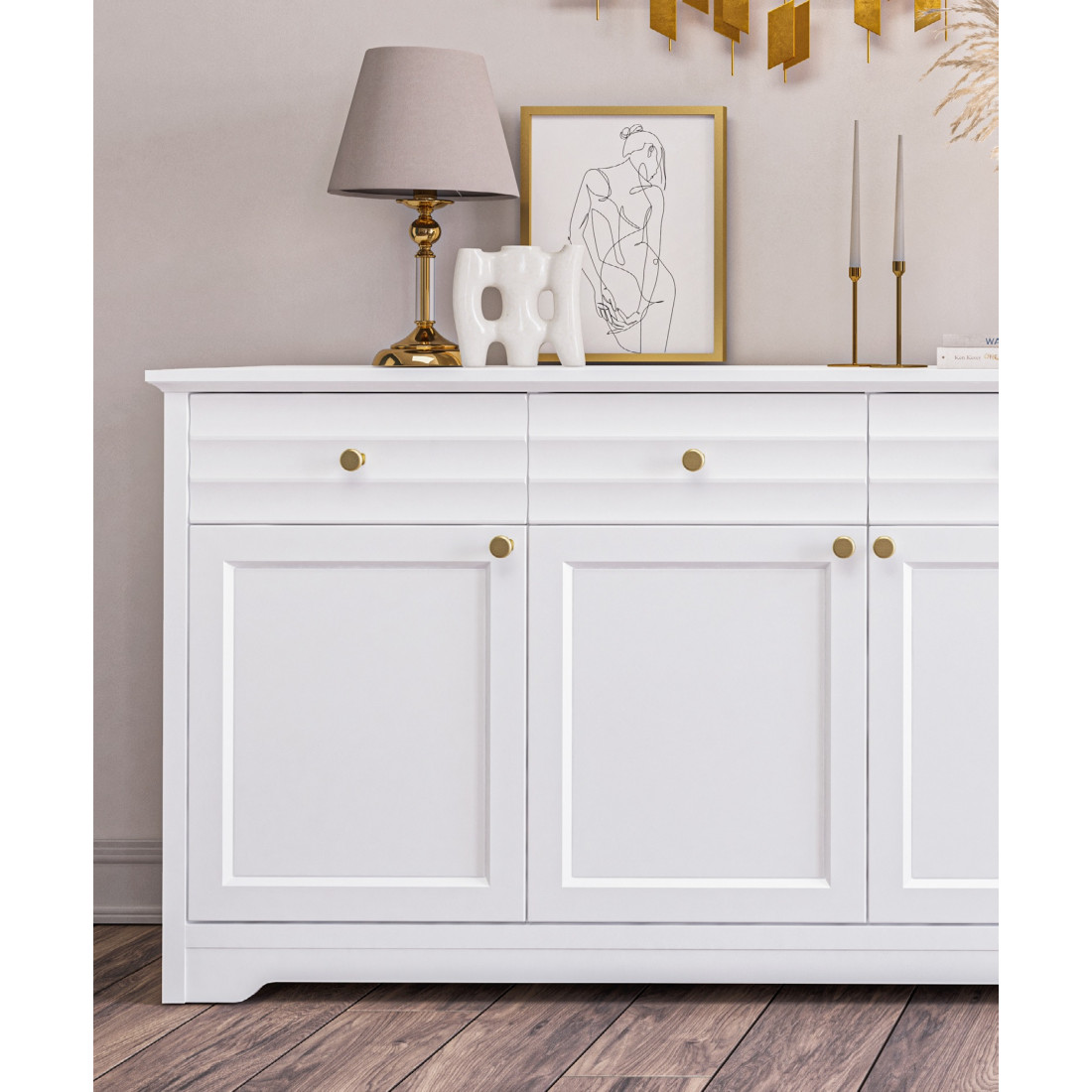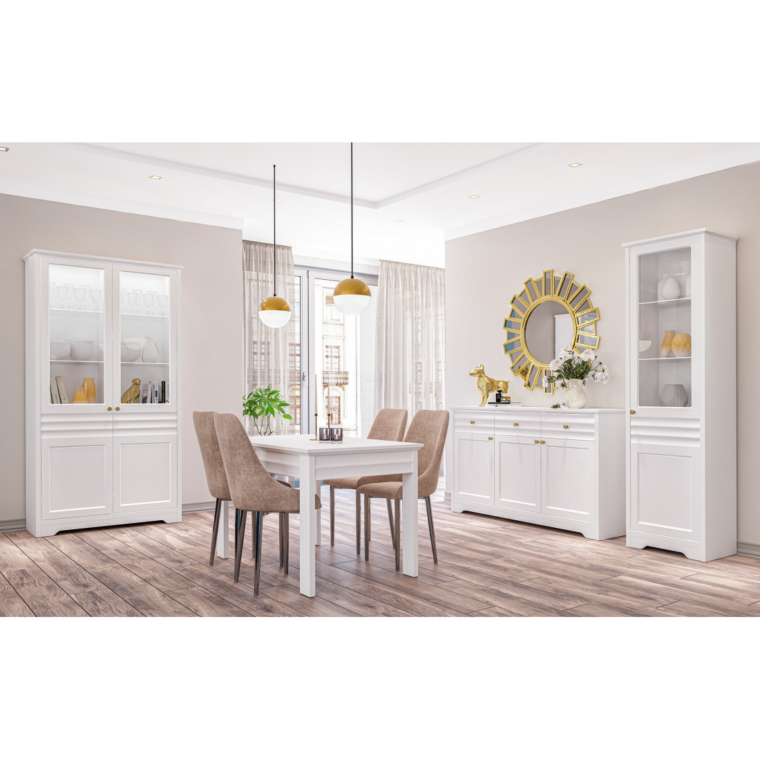 Денвер – это новая коллекция корпусной мебели для спальни, гостиной и столовой. Прямые строгие линии в сочетании с легкой горизонтальной волной на фасадах придают мебели элегантный и уверенный вид. Белый матовый цвет мебели, любимый многими за универсальность, можно сочетать с любым оттенком стен и пола. Округлые металлические золотые ручки разбавляют строгий и лаконичный вид фасадов и добавляют интерьеру утонченности.