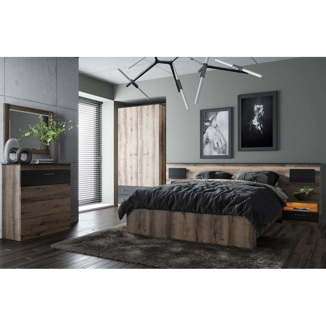 Отличительная черта спальни Джаггер - сочетание контрастов. Это современная мебель, которая хорошо смотрится как в современном, так и в классическом интерьере. Эта многомерность и универсальность были достигнуты благодаря умелому сочетанию дуба монастырского и части фасадов, поддерживаемых в черном цвете.